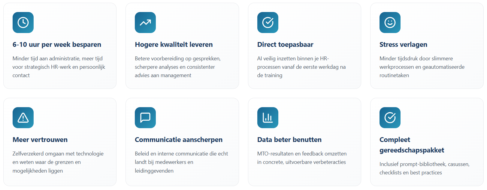 Onze eendaagse training laat je ontdekken hoe technologie en menselijkheid elkaar kunnen versterken. Je leert helder prompten, je verkent echte HR-casussen en krijgt inzicht in de Europese AI Act. Elke editie is actueel, praktisch en meteen toepasbaar.
